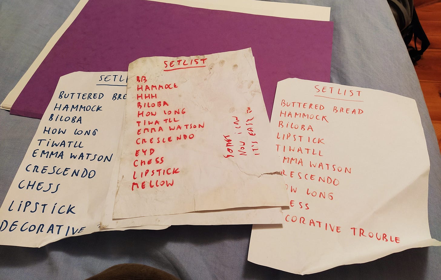 On the setlist we would sometimes still use the old titles. You can spot some beauties on the picture below: He Hoe Ha (HHH), Biloba and Emma Watson. Although I’m not a 100% sure we ever had a proper name for that last song.